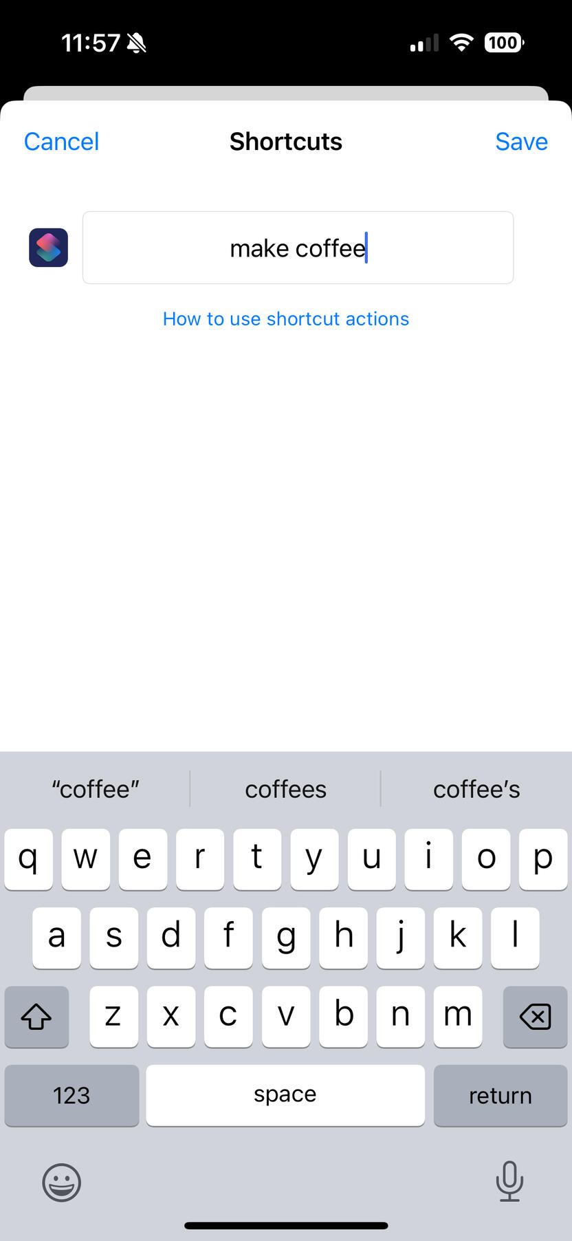 Type in the name of the shortcut you noted from earlier. Make Coffee